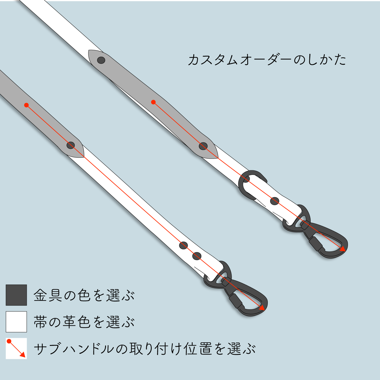 金具の色、革の色、サブハンドルの取り付け位置をお選びいただきカスタムオーダーでお作りいたします。